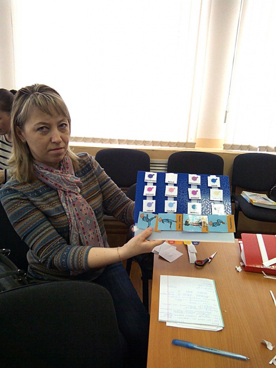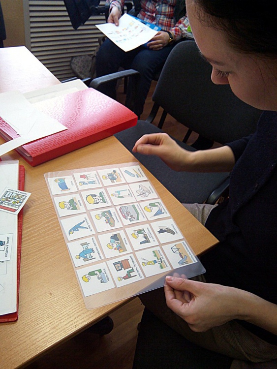Каждый участник мастерской создавал свою книгу с набором карточек РЕСS, которая в дальнейшем послужит для неговорящего ребенка активным словарем. Последовательно, этап за этапом, учились делать книгу. Вырезали, приклеивали липучки, ламинировали страницы и картинки. В итоге у каждого участника получилась своя книга с набором карточек.