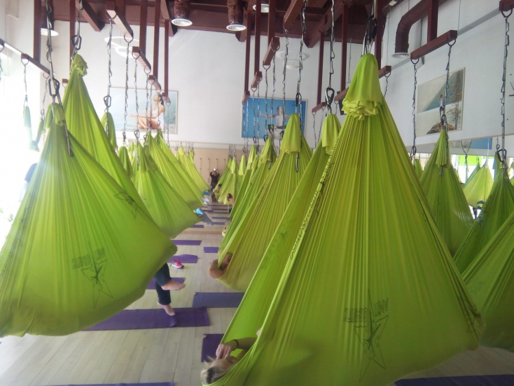 Выполняя упражнения йоги, мы не ищем точку опоры на земле, а учимся взаимодействовать с силами гравитации. В гамаке перевернутые позы тела выполнять намного легче, чем на земле, и не так травматично для позвоночника. В результате таких тренировок увеличивается подвижность суставов и даже те, кто не мог делать шпагат, через несколько занятий в состоянии его выполнить.