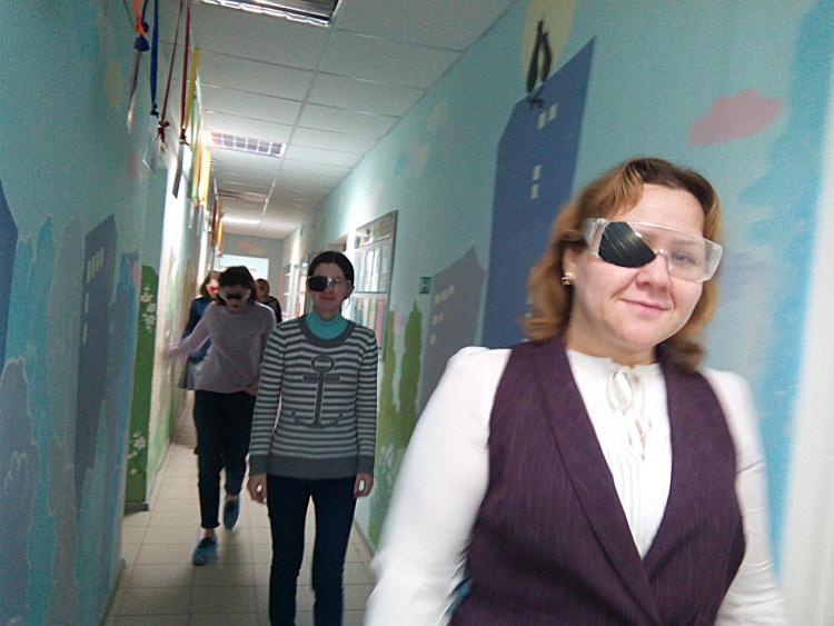 - пройти в очках-тренажерах по плохо-освещенному узкому коридору;