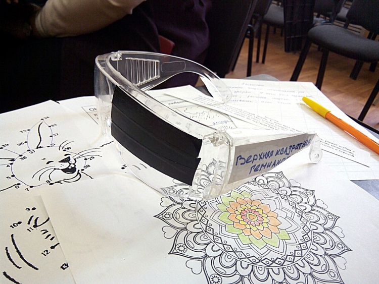 На мастерской с помощью специальных очков-тренажеров родители и педагоги ощутили, как выглядит всё вокруг в восприятии ребенка с особенностью. Первый час мастерской был построен на примере уроков в школе, где взрослые играли роль детей.