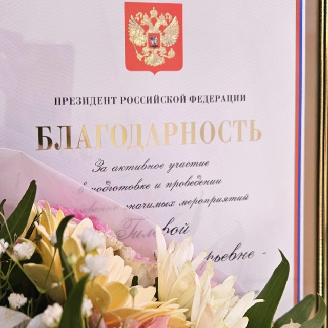 Губернатором Пермского края Дмитрием Махониным нашему руководителю - Анастасии Гилевой вручена Благодарность Президента РФ «За активное участие в подготовке и проведении общественно значимых мероприятий».