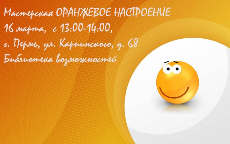 16 марта - с 13:00-14:00, Мастерская "Оранжевое настроение" (с участием детей). Учим ребёнка распознавать цвета, как во время приготовления пищи развить координацию движений, память, внимание, сформировать навыки аккуратности. На мастерскую приглашаются дети и родители желательно в одежде оранжевого цвета, ведущая Моисеева Е.В, логопед, Монтессори-педагог, г. Пермь, ул. Карпинского, д. 68, Библиотека возможностей;