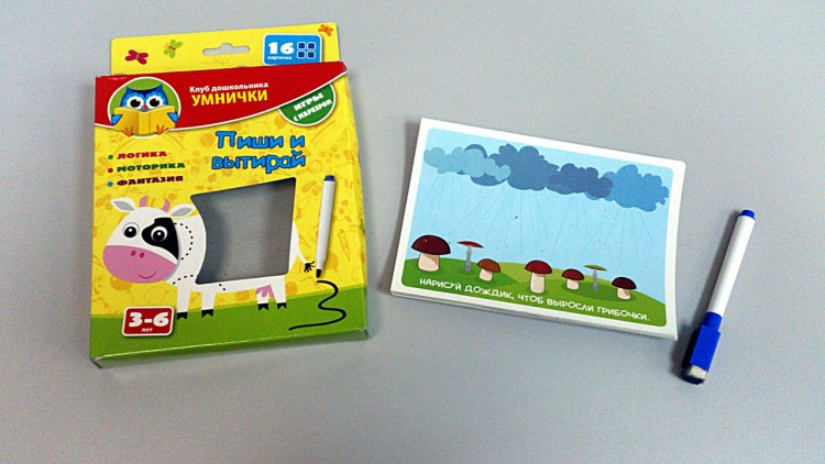 Карточки «Пиши и вытирай» - интересная обучающая игра с заданиями разной тематики – счет, фантазия, логика, подготовка руки к письму, внимание, геометрические фигуры и многое другое. В одном наборе — 16 интересных заданий. Маркер с мягкой губкой, который входит в набор, легко вытирается с ламинированной карточки. Такие карточки можно использовать много раз.