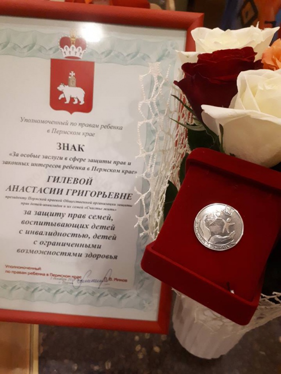 За особые заслуги в сфере защиты прав и законных интересов ребенка в Пермском крае в 2017 году Анастасии почетно вручен Нагрудный знак Уполномоченного по правам ребенка в Пермском крае "Защищать и помогать".