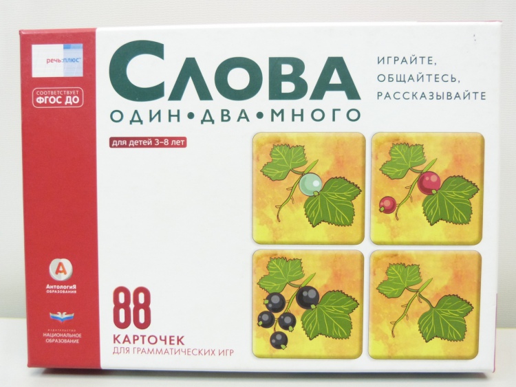 В наборе 88 карточек, на которых изображены предметы в разных количествах: "1 предмет", "2 предмета", "5 предметов" и "нет предметов". Условно карточки поделены на три блока (зеленый, желтый и красный) и шесть грамматических игр.